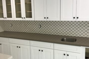 This durable porcelain backsplash enhances kitchen functionality and aesthetics, featuring a modern, neutral design with precise tile alignment for a professional, seamless finish.